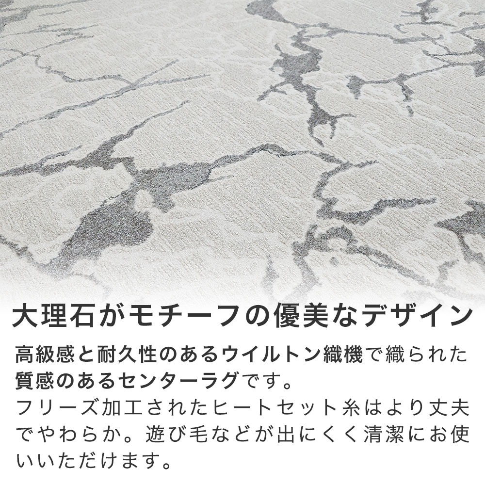 大理石がモチーフの優美なデザイン「ノヴァ」高級感と耐久性のあるウイルトン織機で織られた質感のあるセンターラグです。フリーズ加工されたヒートセット糸はより丈夫でやわらか。遊び毛などが出にくく清潔にお使いいただけます。