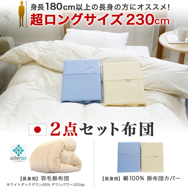 背の高い長身の方用の羽毛掛布団に、掛布団カバーが付いた2点セット布団になります!