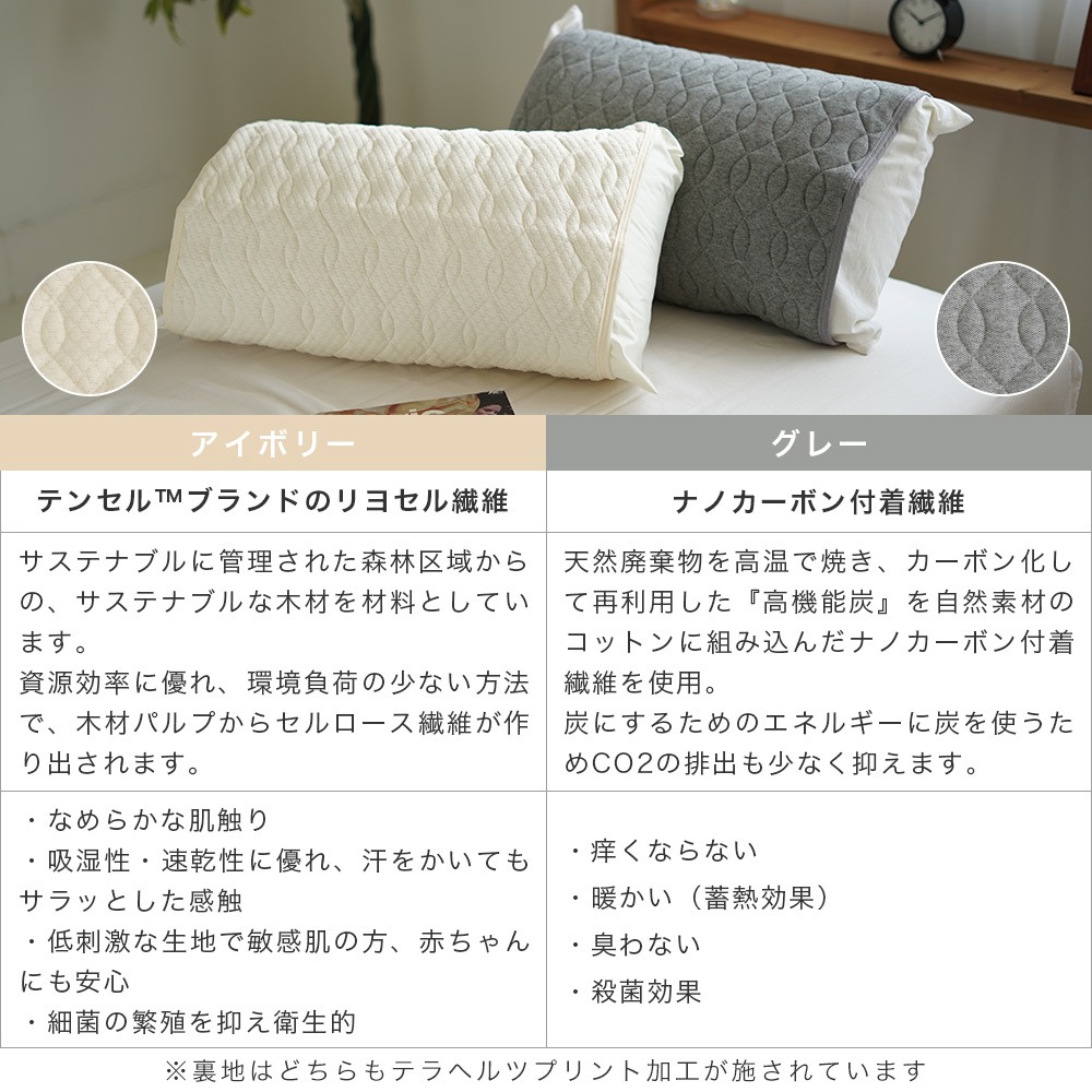 | 生地 | アイボリー:ポリエステル60% 再生繊維(リヨセル)40% グレー:綿100%(ナノカーボン付着繊維) 裏地 ポリエステル65% 綿35%(テラヘルツプリント加工) |