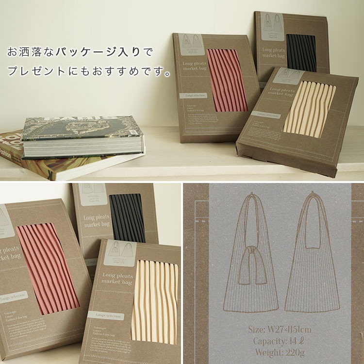 肩掛けもできる大き目サイズで、プリーツを広げると、