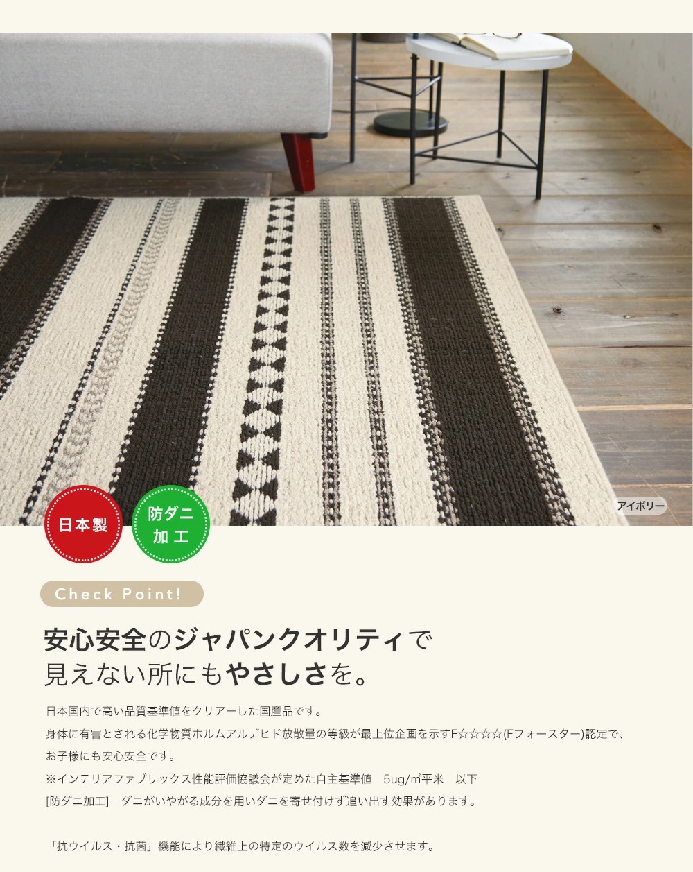 | 仕様 | パイル長8/4mm / 防ダニ / 防炎 / 滑り止め / 床暖対応 |