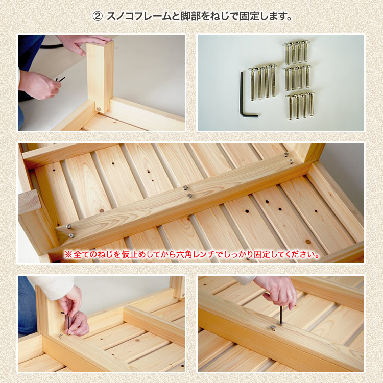 組み立てはベッドの床板と脚部を付属の金具と六角レンチで全16カ所締めて固定するだけ。二人で約10分程で組み立て完成します。