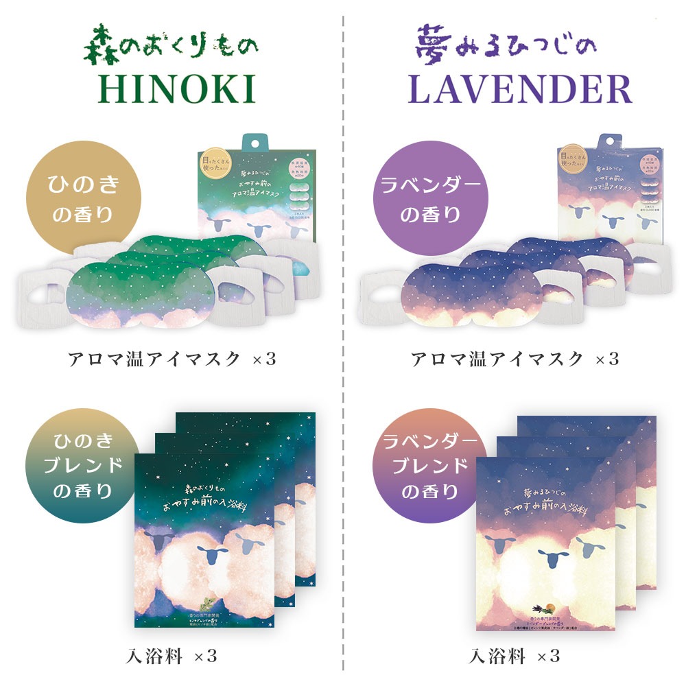 アロマ温アイマスクと、入浴剤をそれぞれ3点セットにした6点セットです。