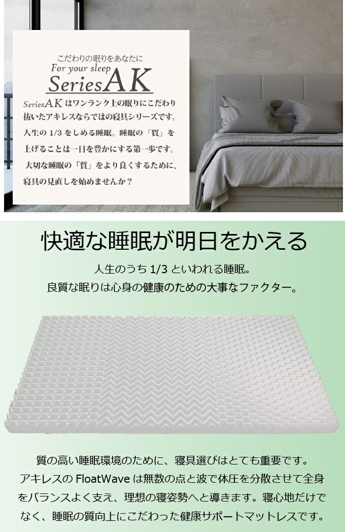| 商品説明 商品名:FloatWaveスーパーハードタイプ シングルサイズ 寝心地を追求した健康サポートマットレス、波の上で眠りを変えるFloatWave 3つのゾーンが身体に合わせ快適な寝心地と寝姿勢を実現する 質の高い睡眠=健康な身体を維持 3ゾーンがワンランク上の眠りに導きます。 ・スーパーハードタイプは、すごく硬めの300N 超硬が自慢の波型凹凸が身体全体の沈み込みを防止 背筋を伸ばし、美しい寝姿勢に導きます すごく硬いマットレスをお探しの方にオススメです。 ・腰が沈み込みにくい寝姿勢 背中・腰部の沈み込みが少なく、背筋が伸びた寝姿勢になります。 硬さ自慢で全身支える スーパーハードタイプ かため300N ・波間(プロファイル加工)がつくる優れた通気性 空気層が波の間から流れ、寝返りのたびに空気が入れ替わり、湿気が溜まりづらくムレにくい ・へたりにくさに自信!復元率95% 耐久性が高くへたりにくい。 8万回の圧縮テストでも実証済 ・厚さ10cm 底付き感を感じさせないしっかり厚さの10cm 敷き布団として直接、床にもベッドフレームの上のベッドマットレスにもなる厚さです。 ・収納、お手入れのしやすさにこだわった3つ折りタイプ 手軽に収納できて女性でも折りたたみしやすいサイズです。 製品重量約5.4kg 持ち運びラクラク!収納ラクラク! お手入れは広げて陰干し ・使い方いろいろ 今お使いの寝具に合わせてグレードアップ! ベッドに 床に直接 すのこの上に 敷き布団の下に 表生地にはキルティング加工を施しております。 優しい肌触り良い生地です。 カラーは表面にGray(グレー)、側面にBrown(ブラウン)とDeepRed(ディープレッド)をご用意。 持ち運びしやすい!コンパクトな圧縮梱包でお届け 生産工場から密封された状態でお客様のもとへ。 マットレスはお客様の手に渡るまで外気に触れず、とても衛生的です。 ビニール袋を開封後、しばらくすると復元します。 安心の日本製! 素材(ウレタンフォーム)から製品仕上げまで日本国内で製造しております。 ※側生地は中国製です。 |