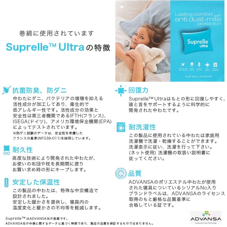 | 中身 | 巻綿 ポリエステル100% 0.7kg (マイティトップ®2エコ|防ダニ・抗菌・防臭加工) 中芯 ポリエステル固綿 1kg |