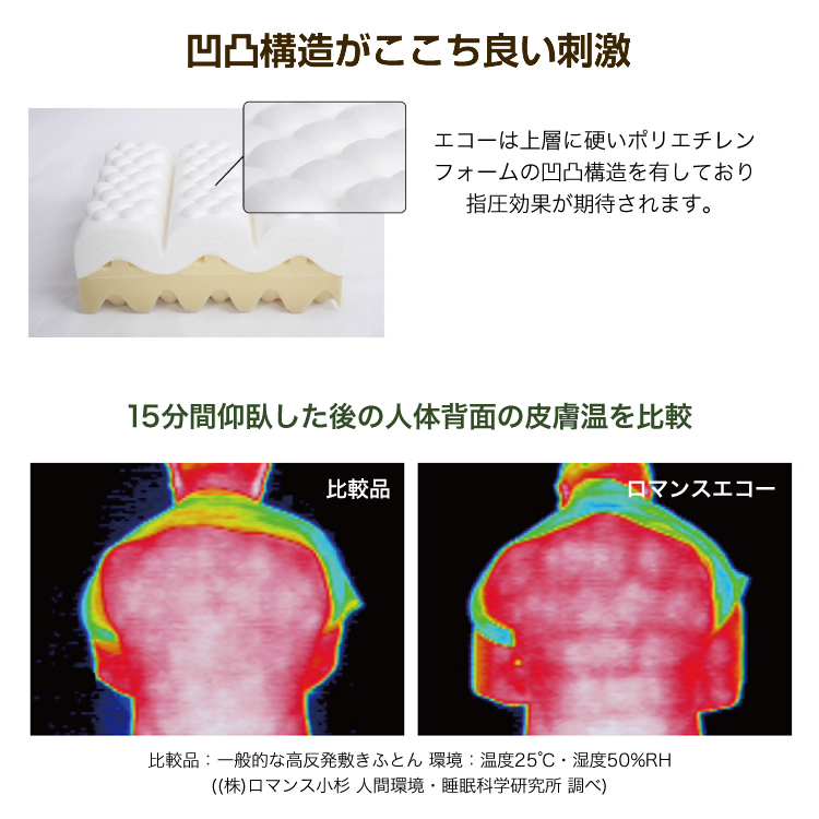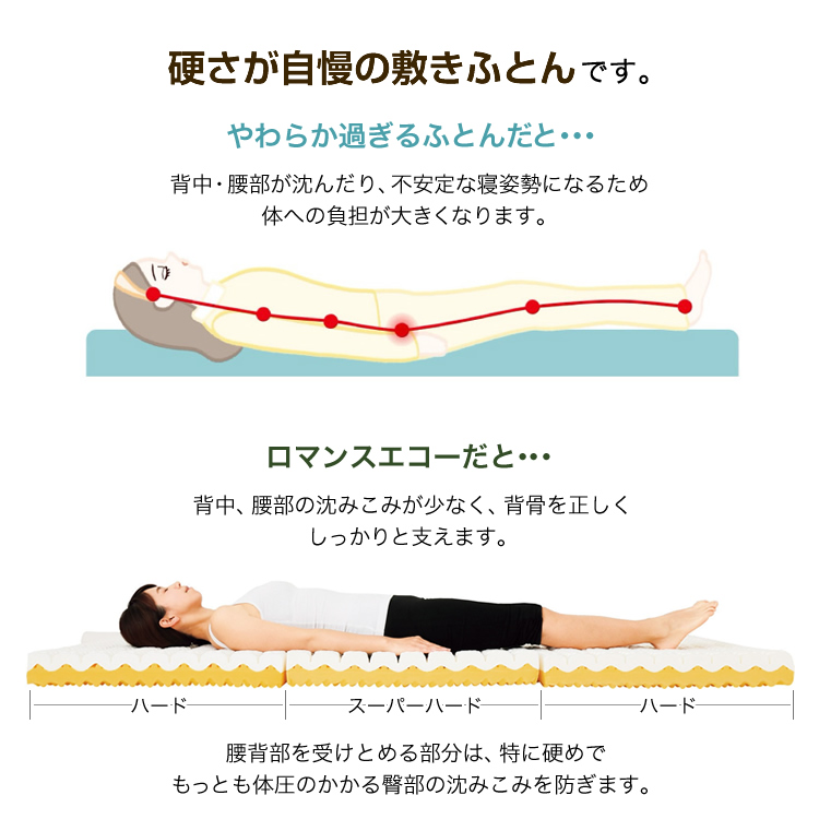 朝、起きたときにスッキリしない方は多くいらっしゃいます。ロマンスエコーはそういった方に向けて作られた硬さが自慢の敷ふとんです。