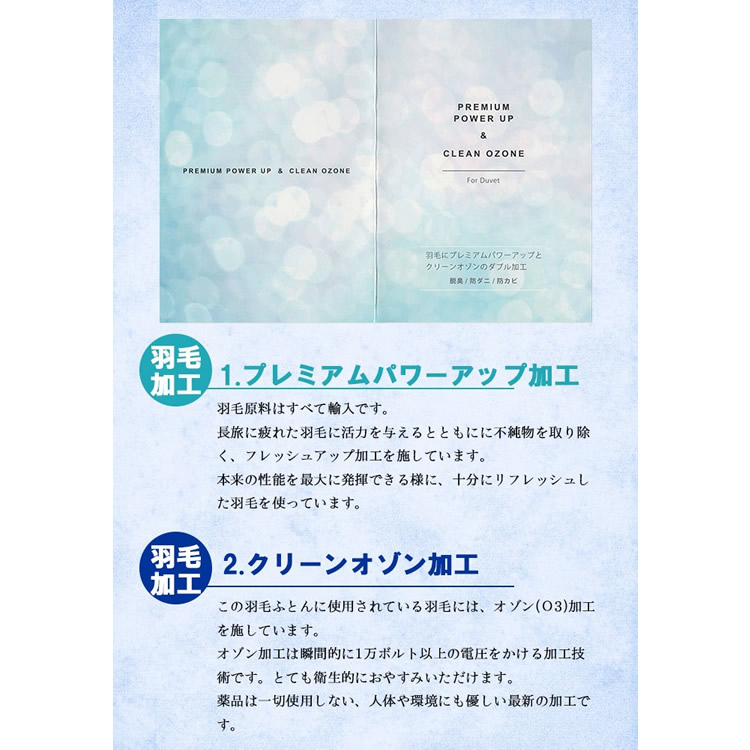 | 中身 | ホワイトダックダウン 90% フェザー 10% 約2.1kg (エクセルゴールドラベル ダウンパワー350dp) |
